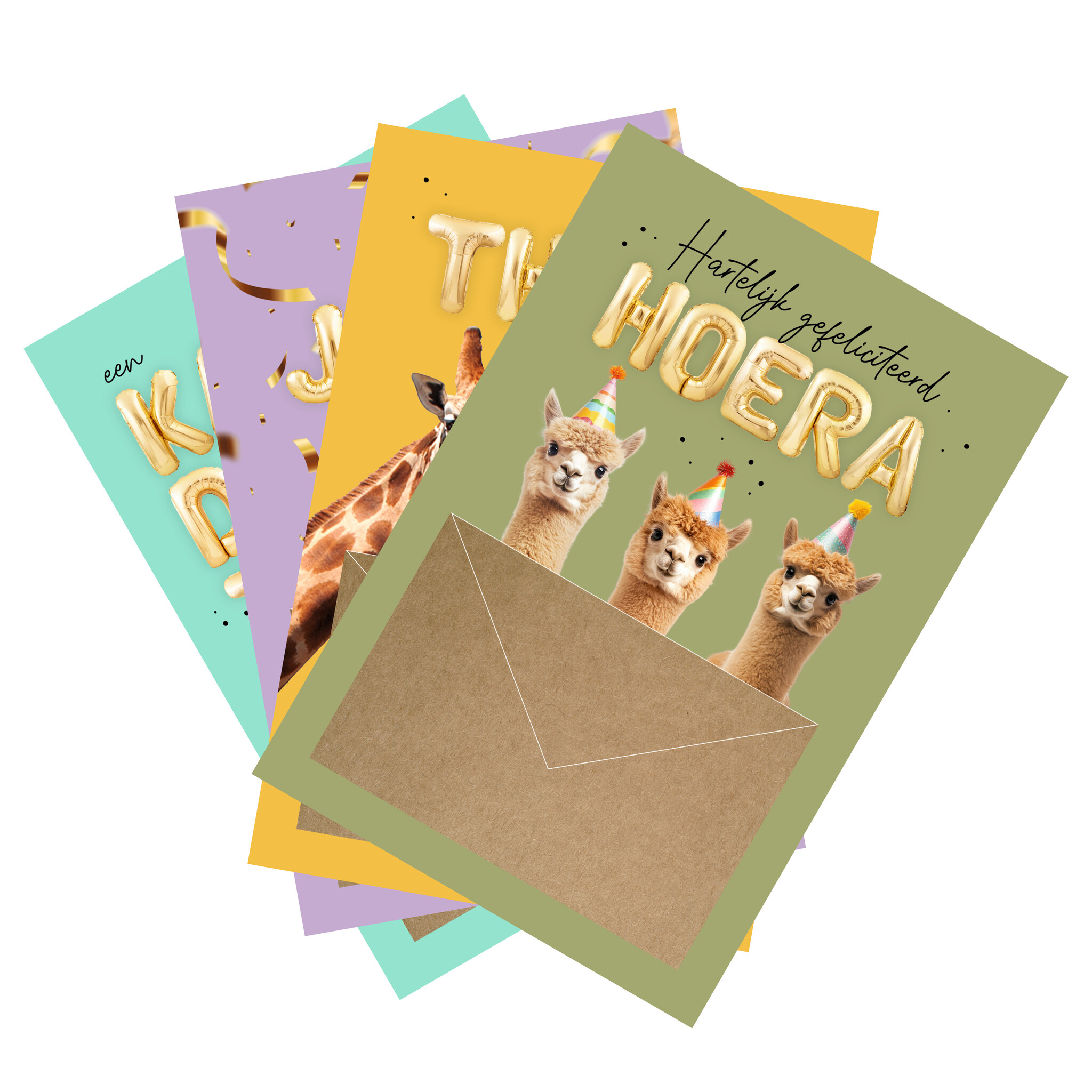 De serie Balloon bestaat uit 16 unieke, dubbelzijdige wenskaarten (11,5 x 17,0 cm - A6 formaat) van stevig 300 grams sulfaatkarton. Binnenin is de kaart blanco, zodat je alle ruimte hebt om je eigen, persoonlijke boodschap te schrijven. Uniek aan deze serie is het kraftpapier envelopje op de voorkant van de kaart. Dit maakt het geven van geld of een cadeaukaart persoonlijk en leuk.