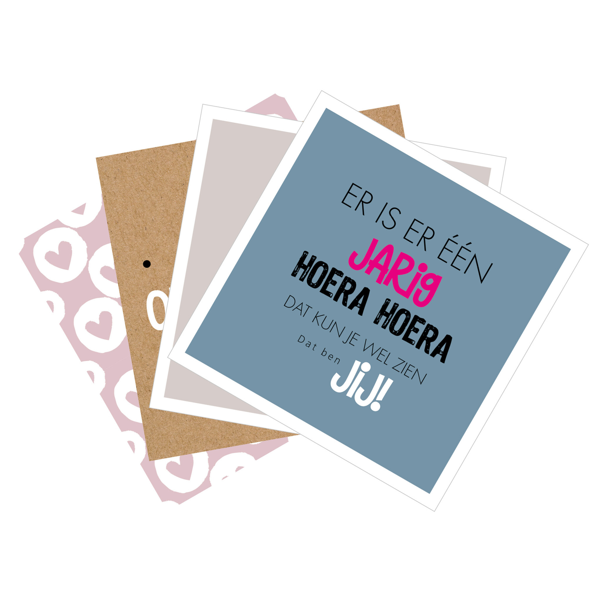 Het pakket bestaat uit 42 verschillende motieven à 6 stuks (excl. display). De wenskaarten zijn ook los verkrijgbaar. Leuk te presenteren in onze 42-vaks vloerdisplay wenskaarten vierkant.