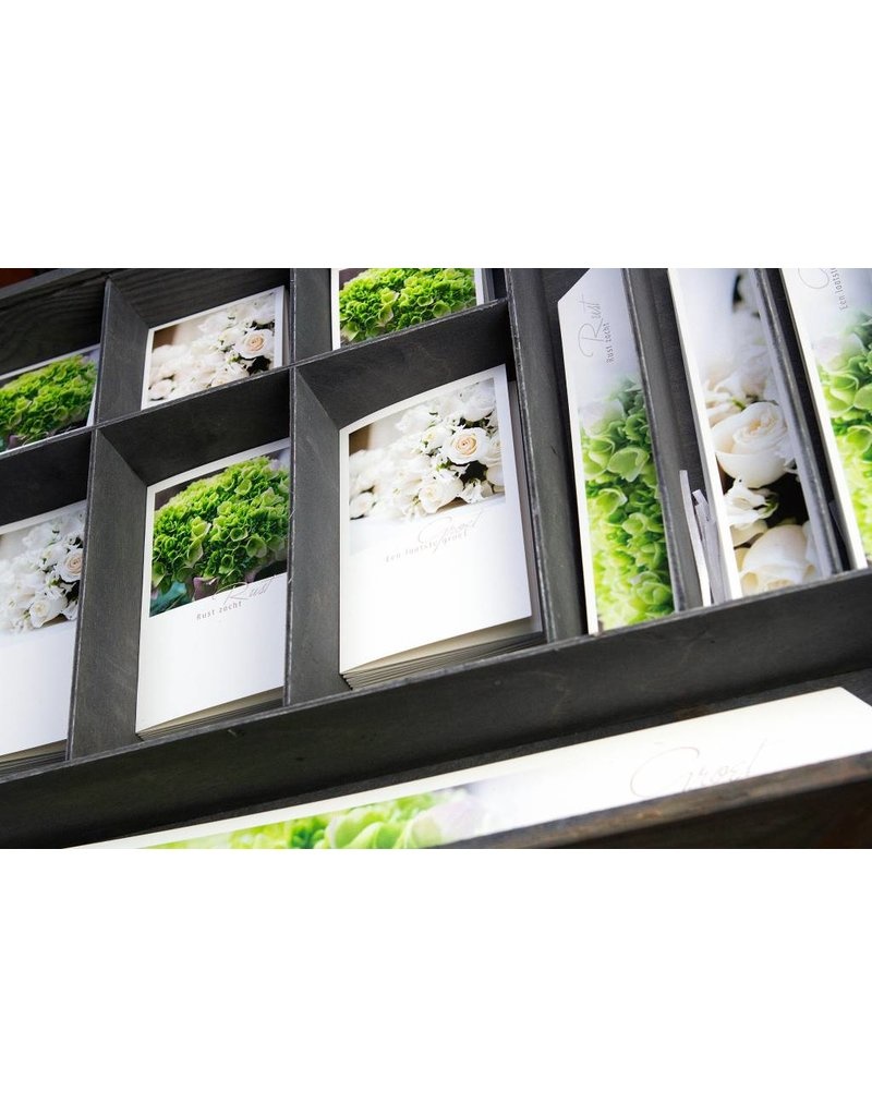 Mocht het ribbon formaat aan een groter bloemstuk te klassiek gevonden worden, kan gekozen worden voor deze grotere kaart. Een groter bloemstuk wordt vaak gegeven door meerdere personen en op dit formaat kunnen al hun namen worden opgenomen. Zelfs dan is er nog voldoende ruimte voor een warme, laatste groet.