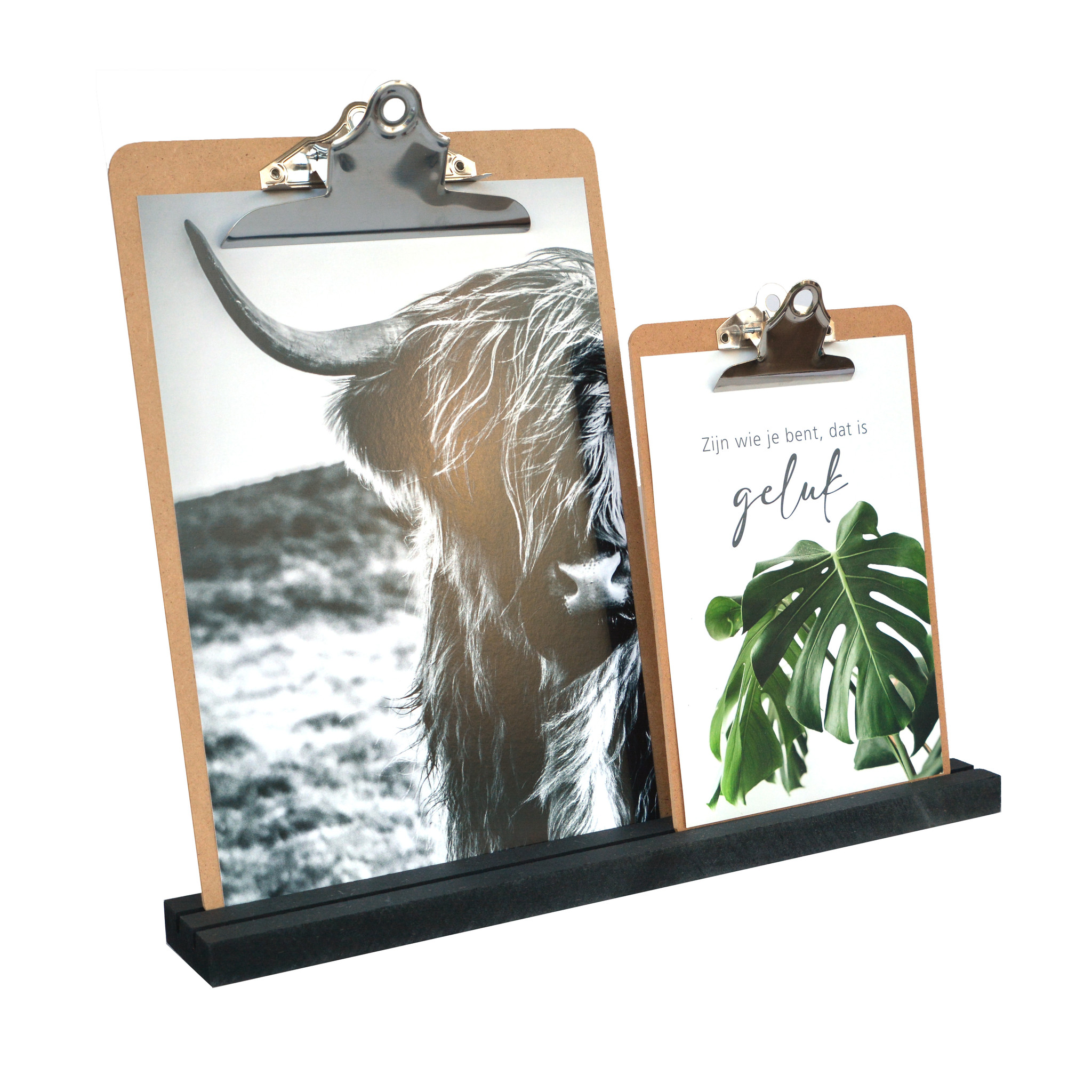 In deze houten dubbele klembordhouder kun je zowel een A4 klembord als een A5 klembord kwijt. Super leuk om ze op deze manier te presenteren. De klembordhouder heeft een afmeting van L400 x B57 x H18mm en is uitgevoerd in zwart.