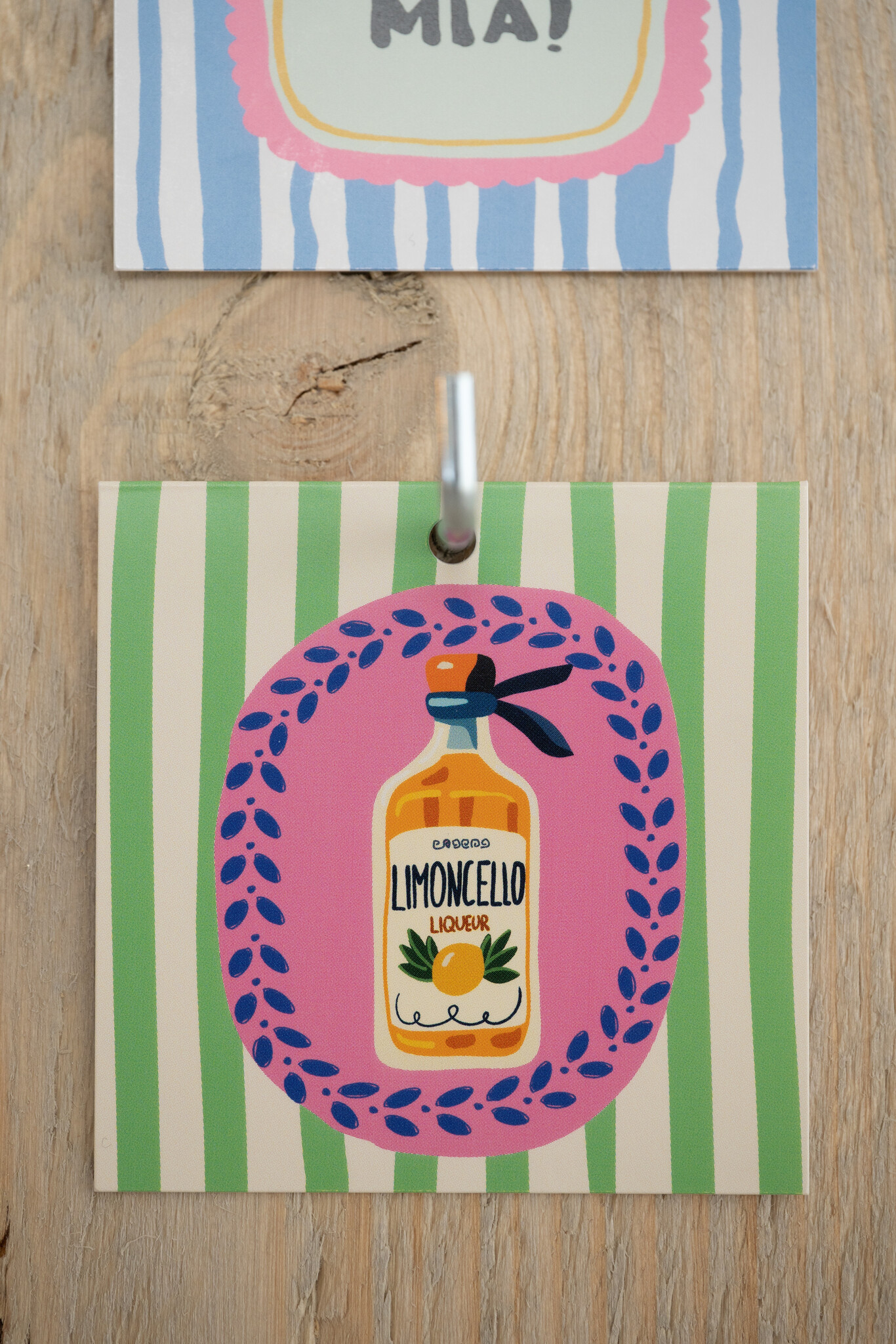 Vrolijk limoncello-kadokaartje uit de Costa-serie, dubbel, sulfaatkarton 250 gr., 7,5 × 7,5 cm.