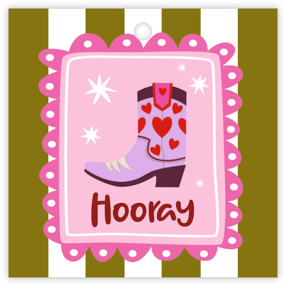 Een gedurfd kaartje voor een verjaardag of om iets anders te vieren. Een vrolijk kaartje met een cowboylaars en de tekst "Hooray".