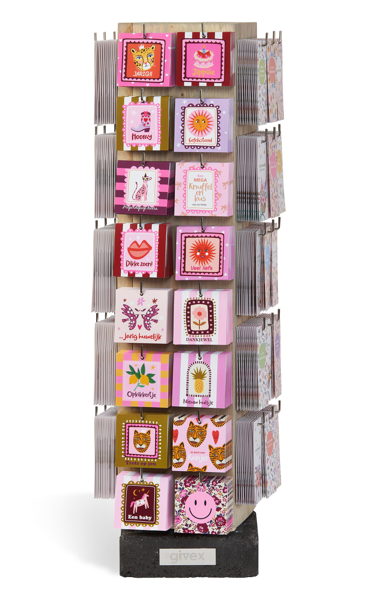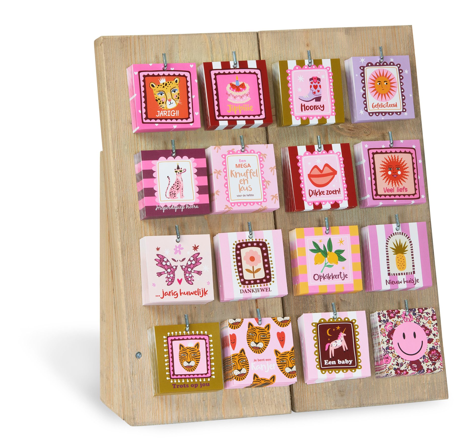 Hang de kadokaartjes aan onze praktische toonbankdisplay voor een aantrekkelijke presentatie. Naast kadokaartjes verkopen we ook een uitgebreide collectie Sizzy postkaarten.