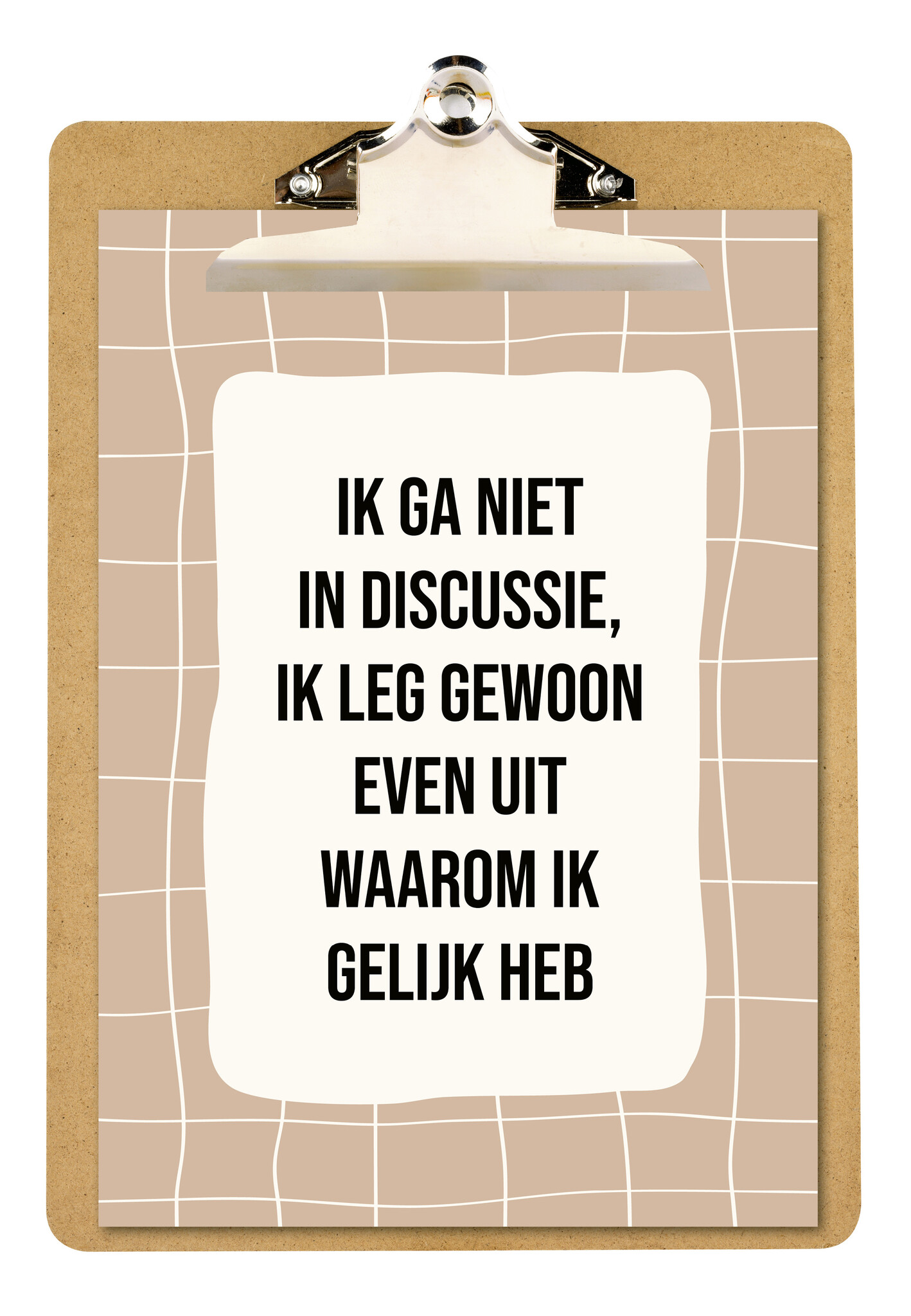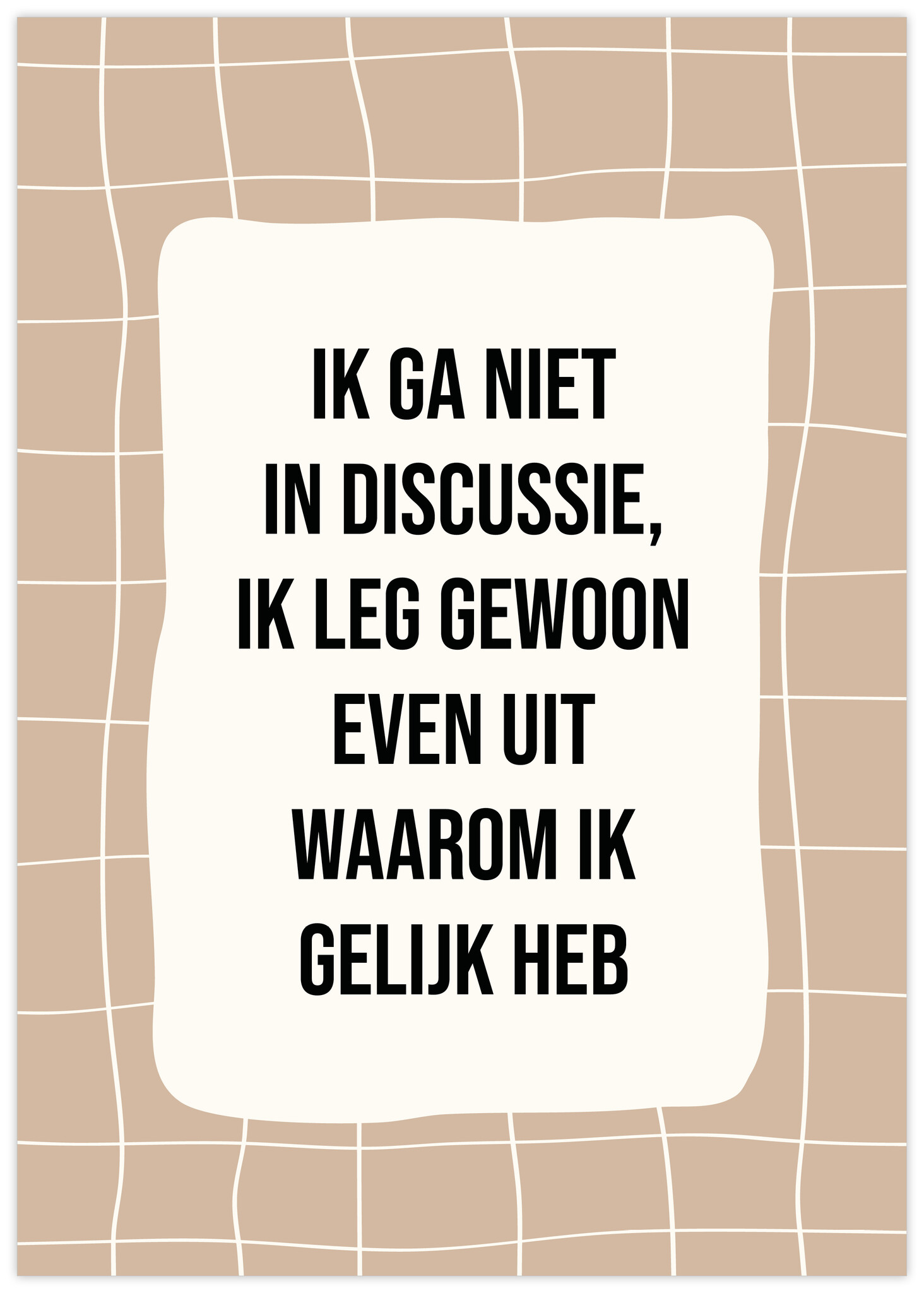 Humoristische A4-poster met de tekst Ik ga niet in discussie, ik leg gewoon even uit waarom ik gelijk heb.