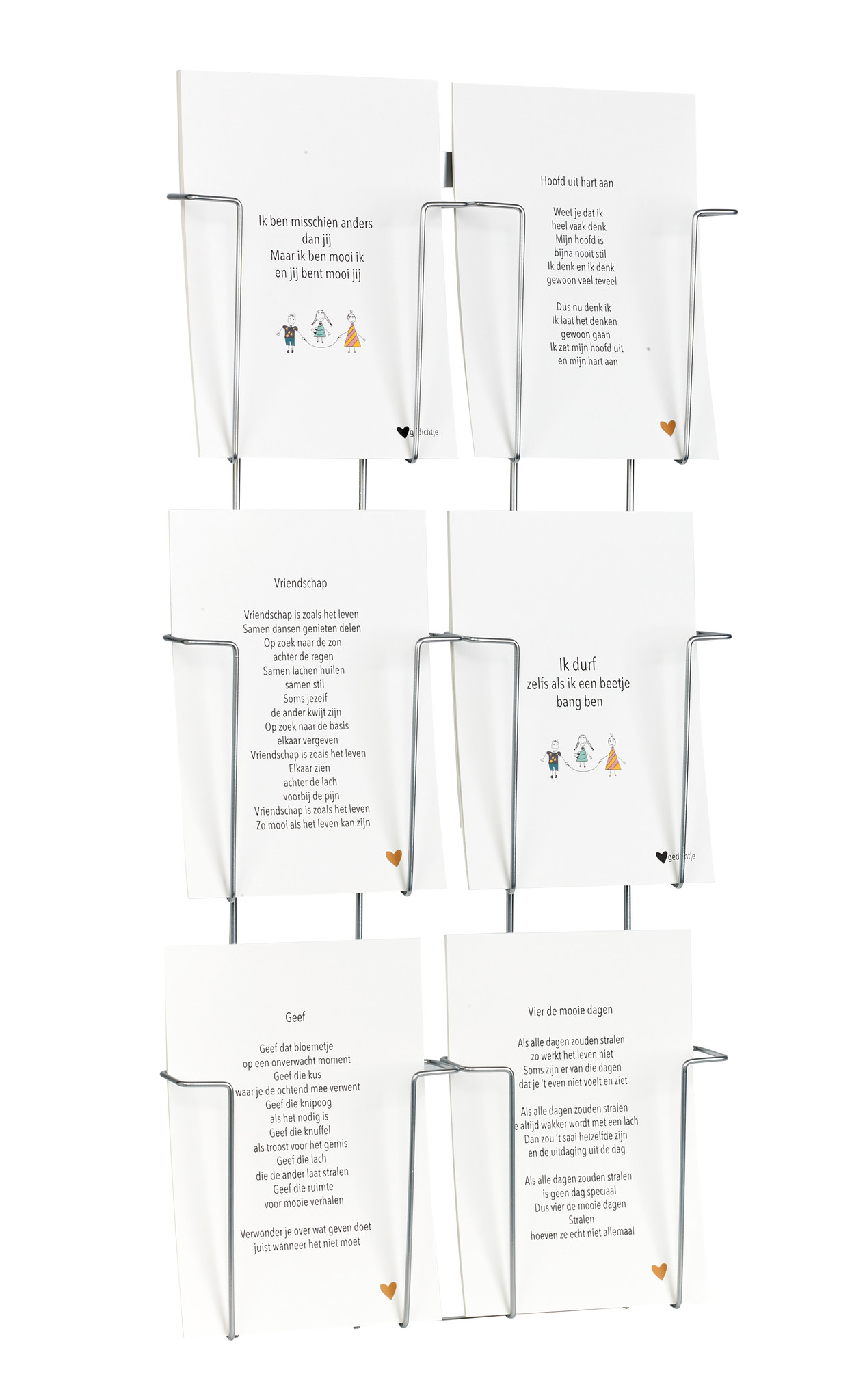 Kleine posters zijn razend populair om cadeau te geven, maar ook om jezelf cadeau te doen. Ze zijn leuk voor aan de muur, maar ook zeer geschikt om neer te zetten in bijvoorbeeld een houten standaard. Een ideaal product voor in jouw winkel. Onze posters zijn uitgevoerd in A5-formaat en op luxe papier (conqueror verge) gedrukt. De posters zijn per 5 stuks verkrijgbaar.