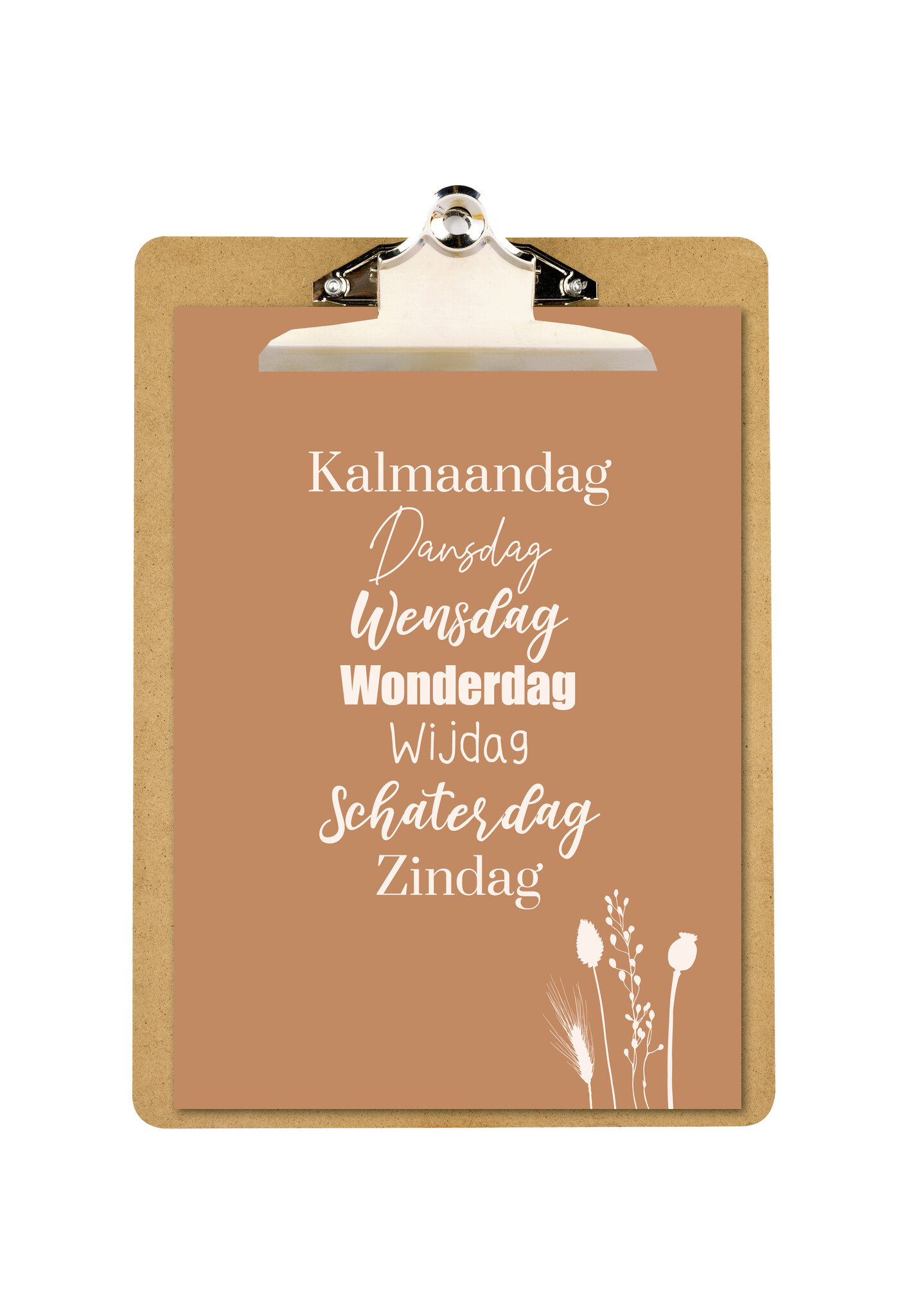 Speelse A5-poster met de tekst Kalmaandag, dansdag, wensdag, wonderdag, wijdag, schaterdag, zindag.