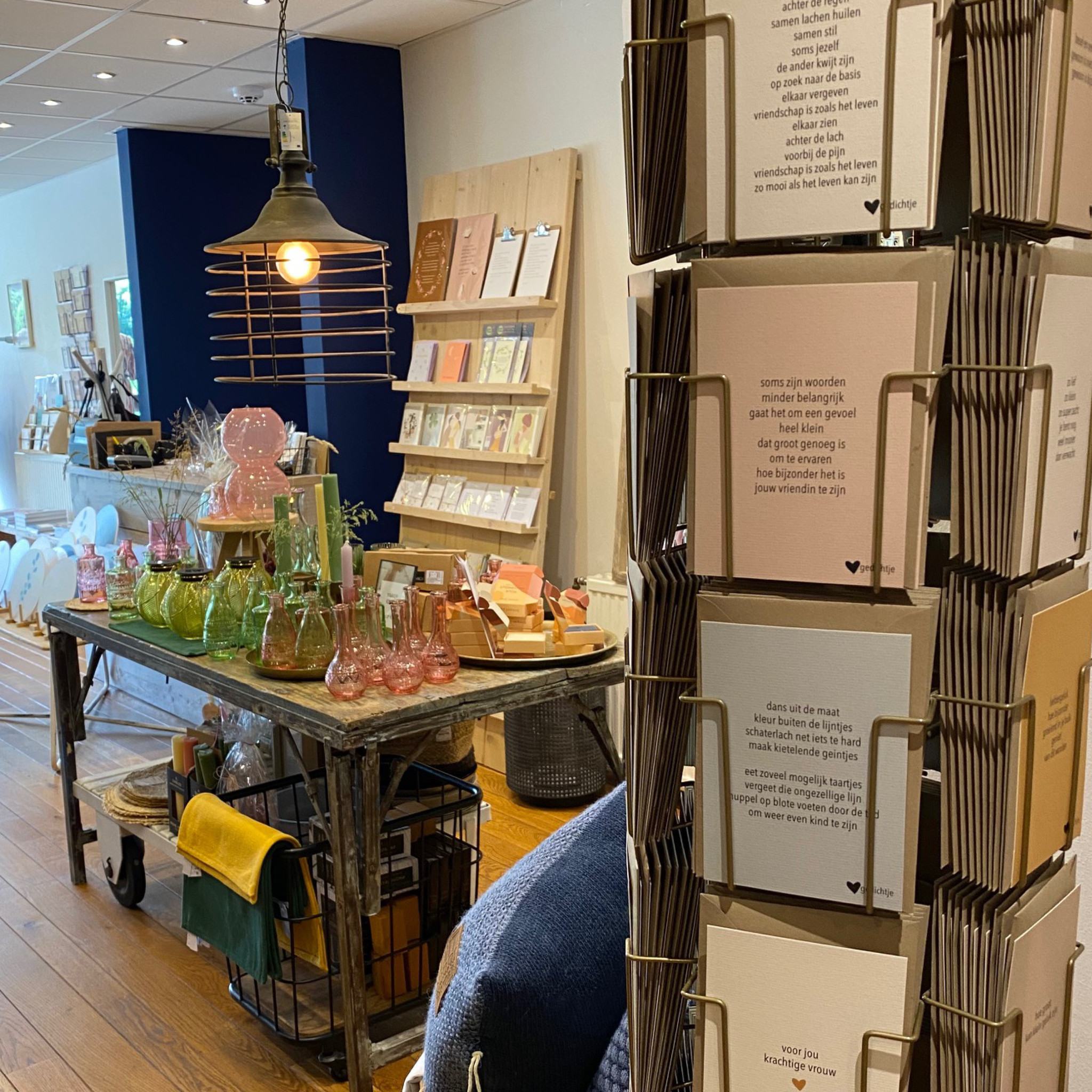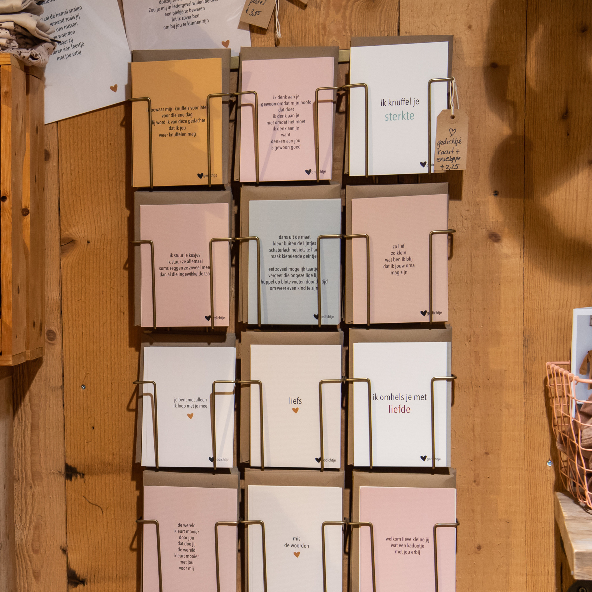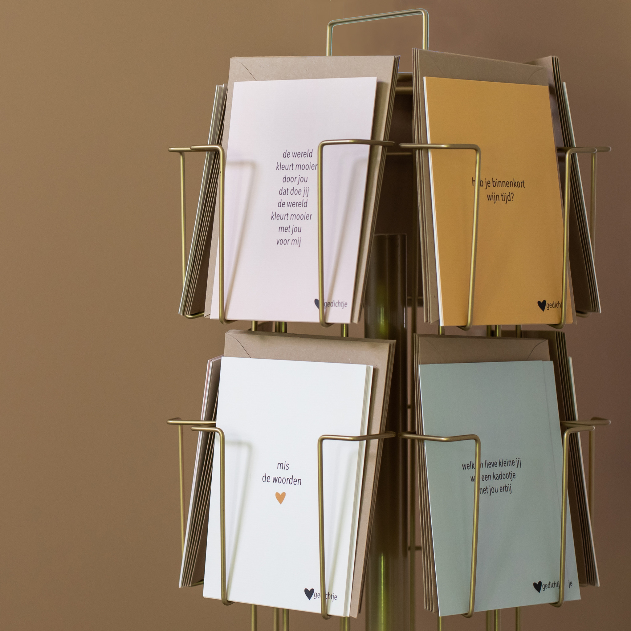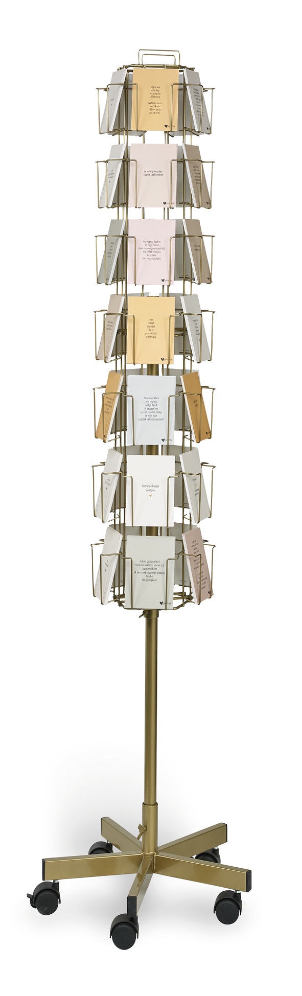 De producten van Hartgedichtje zijn ontworpen en geschreven vanuit het hart en geïnspireerd door het leven. De collectie Hartgedichtje bestaat onder andere uit 80 postkaarten. De woorden die zijn gebruikt kunnen iemand oprecht doen glimlachen of tot tranen roeren. Bovendien zijn deze hartverwarmend en dragen bij aan kleine geluksmomentjes. De postkaarten staan super mooi in de 35-vaks vloerdisplay goud.
