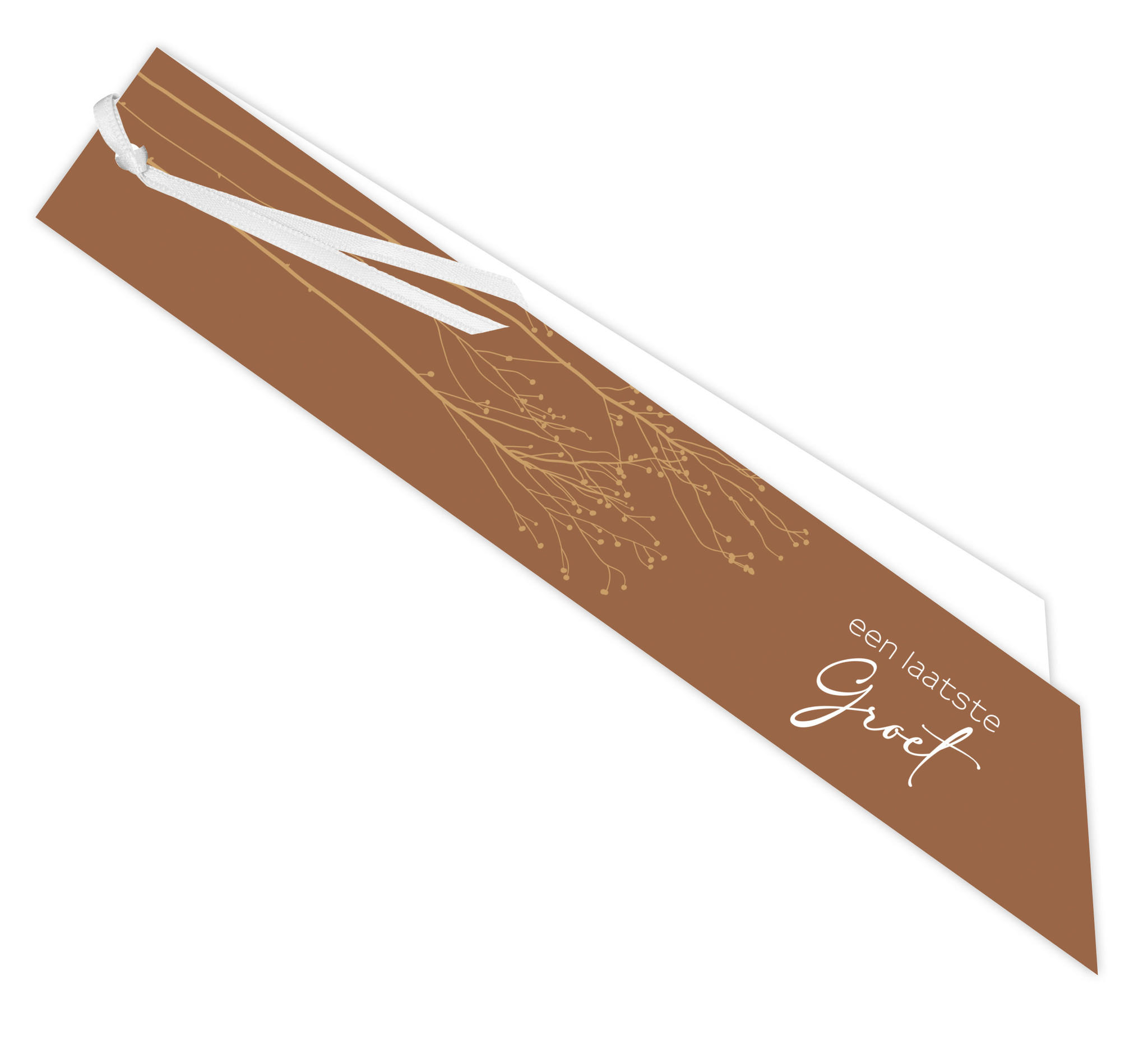 Dit model van de ribbon is de meest gekozen vorm uit onze collectie. Qua formaat bijzonder geschikt aan een bescheiden rouwboeket. Mooi vormgegeven waarbij de tekst ook op redelijke afstand makkelijk te lezen is. In 'schaarvorm' gepositioneerd is ook de persoonlijke, zelf geschreven tekst aan de binnenkant heel goed leesbaar.