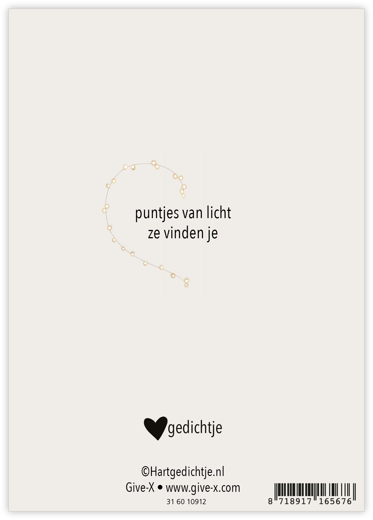 Puntjes van licht ze vinden je. In deze serie zitten 35 Puntjes van Licht. Het zijn dubbele kaarten inclusief kraft envelop. Op de kaarten staan bemoedigende en inspirerende Hartgedichtjes met eenvoudige illustraties.