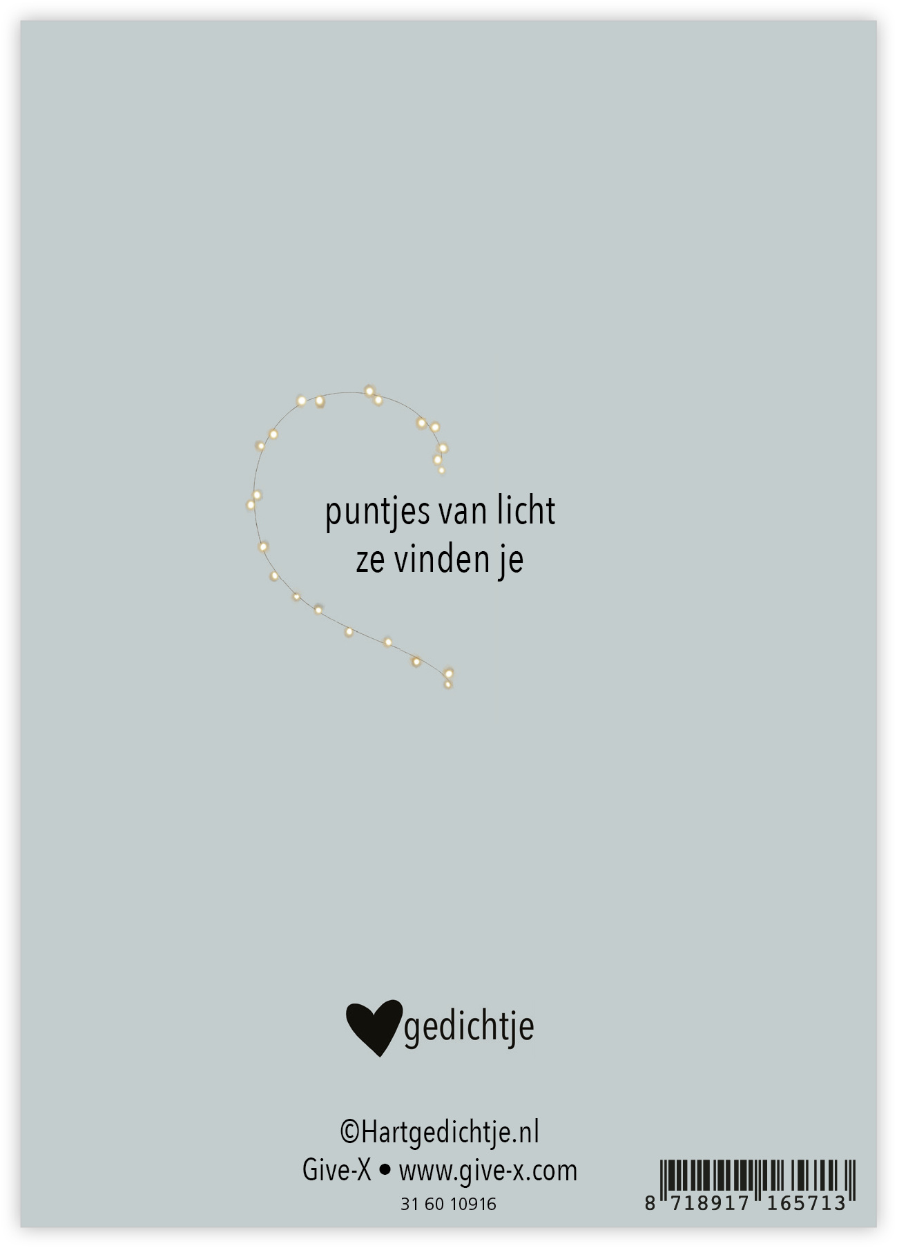 Puntjes van licht ze vinden je. In deze serie zitten 35 Puntjes van Licht. Het zijn dubbele kaarten inclusief kraft envelop. Op de kaarten staan bemoedigende en inspirerende Hartgedichtjes met eenvoudige illustraties.
