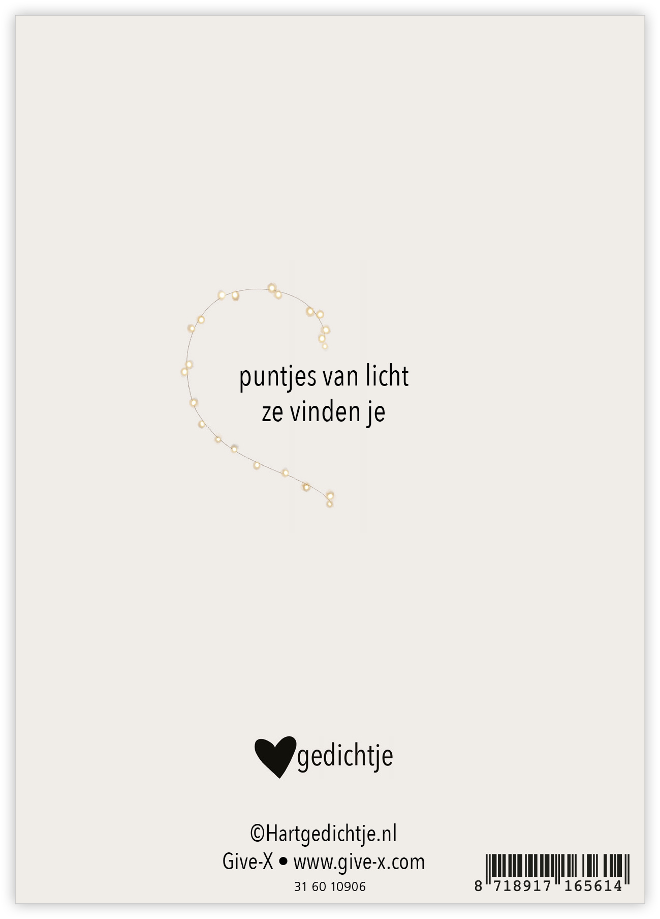 Puntjes van licht ze vinden je. In deze serie zitten 35 Puntjes van Licht. Het zijn dubbele kaarten inclusief kraft envelop. Op de kaarten staan bemoedigende en inspirerende Hartgedichtjes met eenvoudige illustraties.