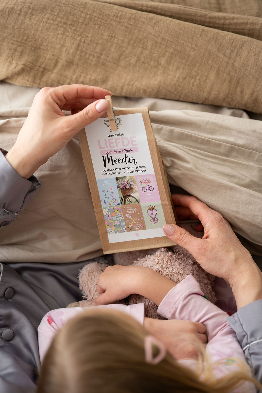 Een leuk kadootje voor de allerliefste moeder. Dit zak liefde heeft 6 postkaarten, speciaal voor mama. Geef ze een mooi plekje met de bijgeleverde houder en geniet van de warme boodschap. Je kunt ze natuurlijk ook versturen naar een persoon die je lief hebt!